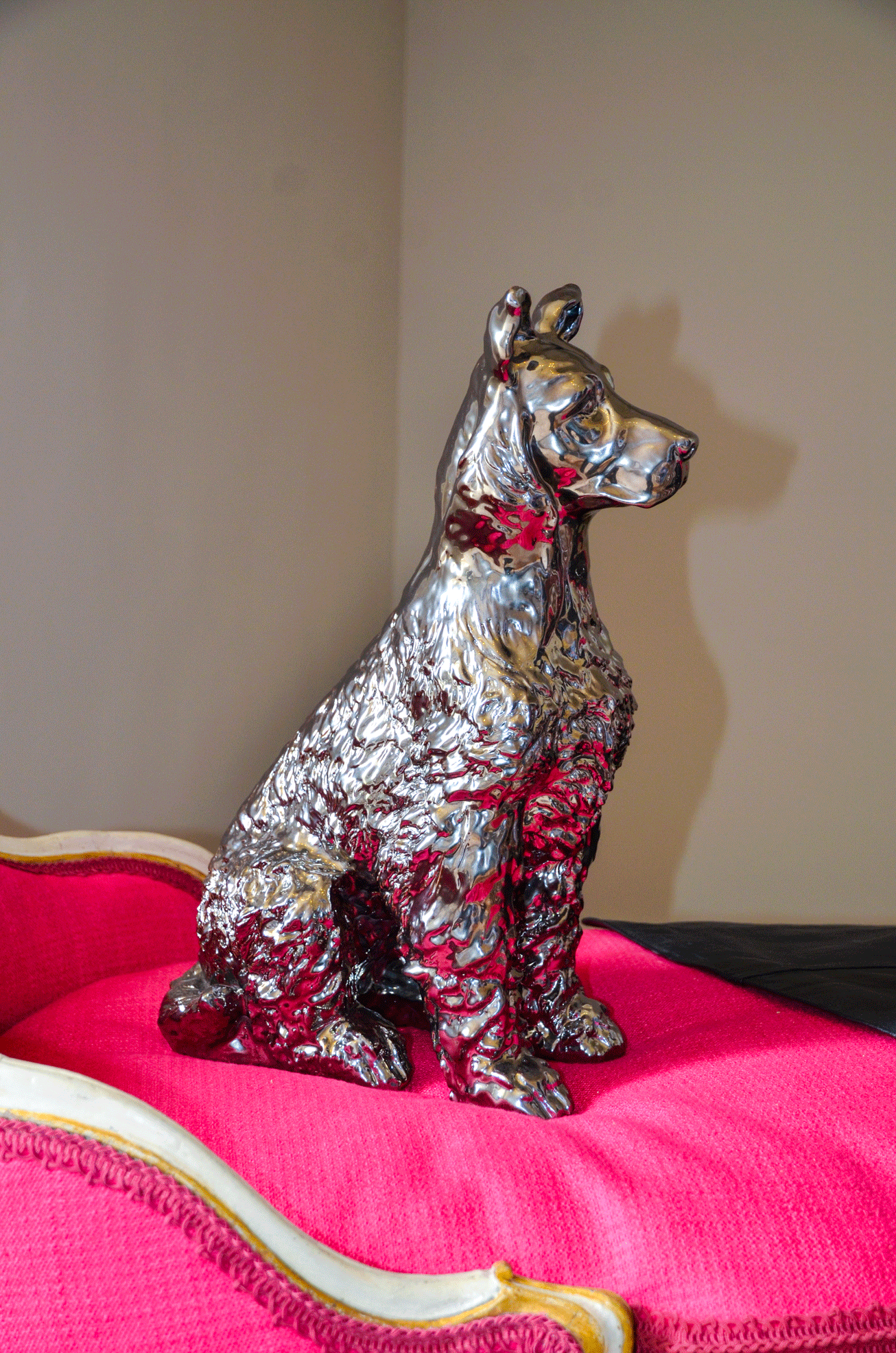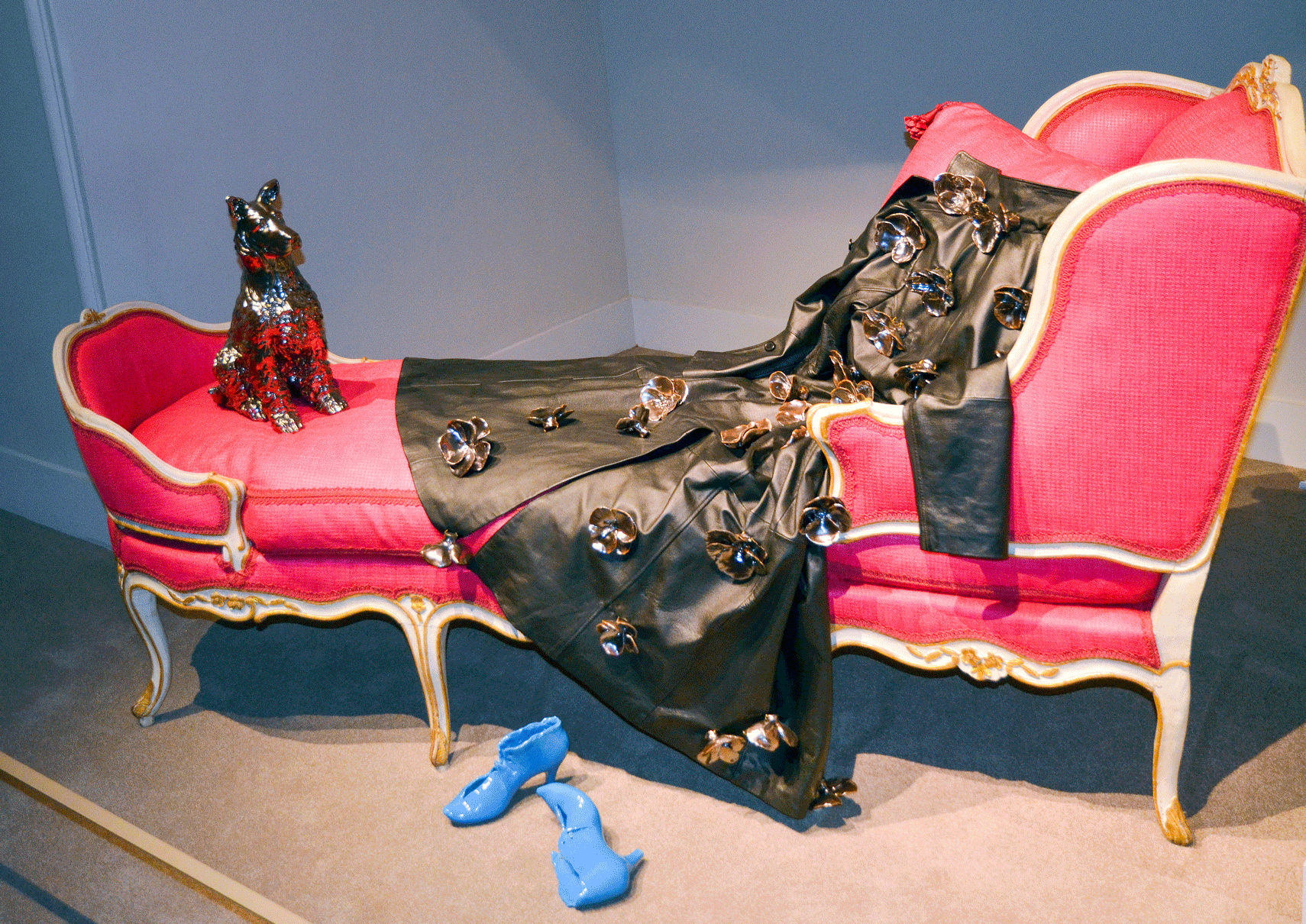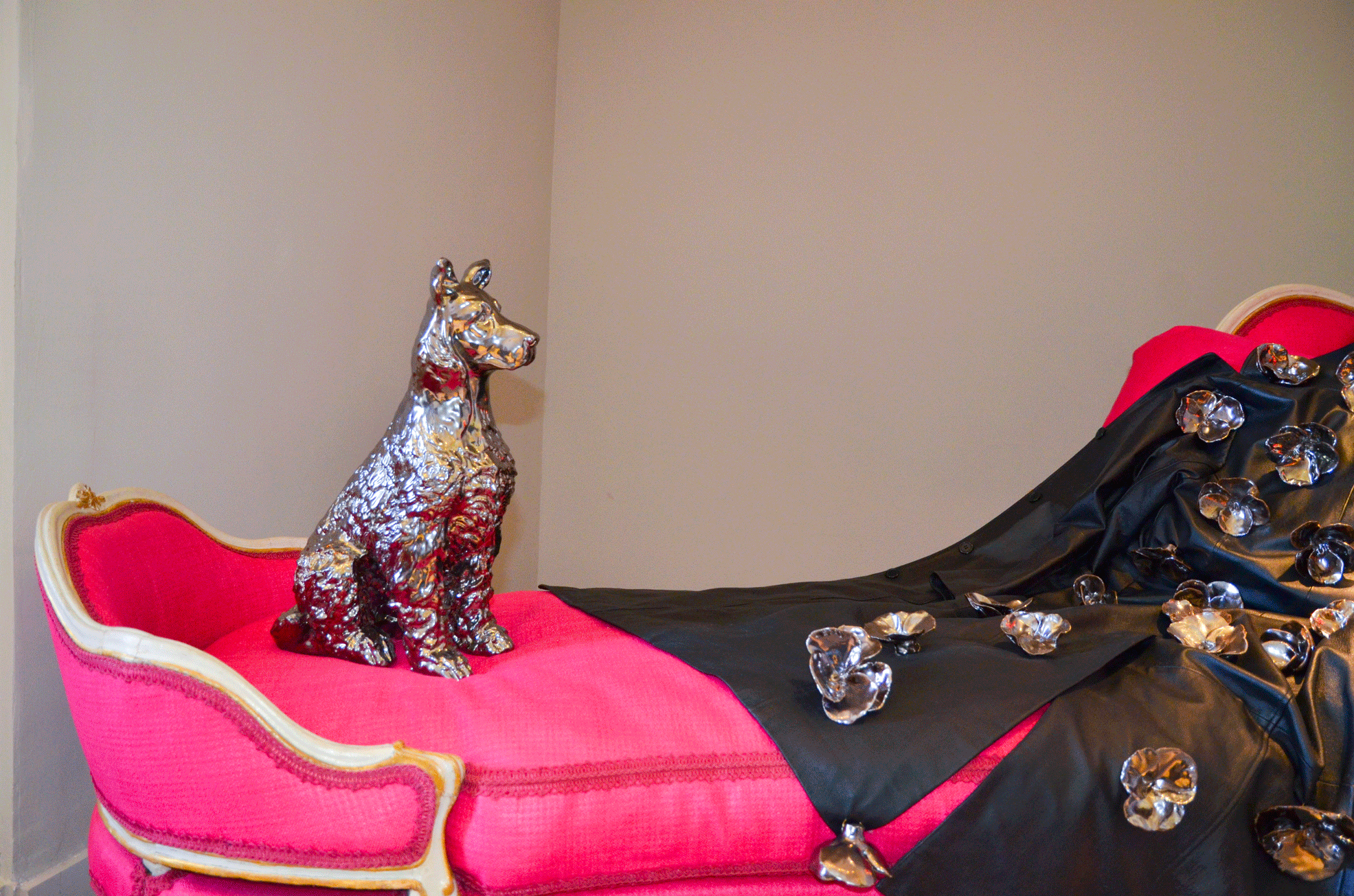 Dans l'installation du musée Borely, un chien céramique se tient assis sur la méridienne devant un manteau de cuir noir brodé de pensées en céramique émaillées platine.