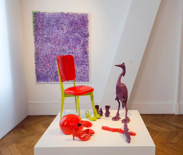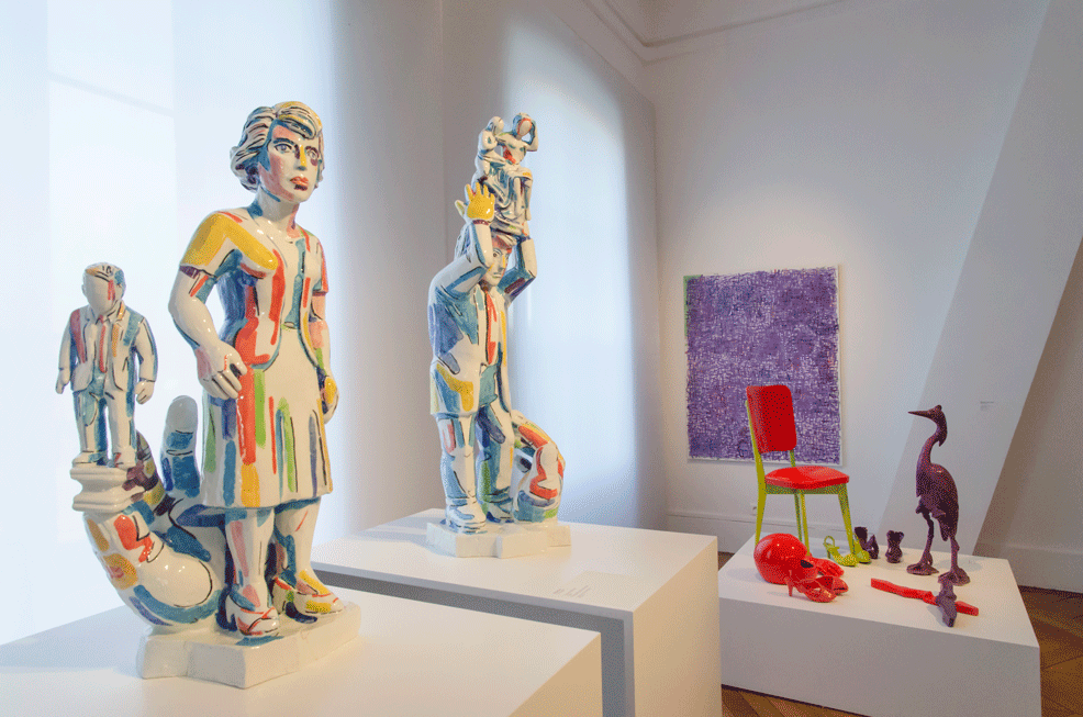 Vue de l'exposition, au premier plan, céramiques de Viola Frey.